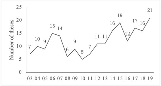 From 2003 to 2019, the master’s theses written by students of Jinling Union Theological Seminary can be divided into three stages: the years from 2003 to 2006 had seen a fluctuating upward trend in terms of the number of master’s theses, which peaked at 15 in 2006; the years from 2006 to 2010 exhibited a slightly declining trend with the number of theses reaching the lowest point in 2010; between 2010 and 2019, the number of master’s theses presented a fluctuating upward trend again, with total annual numbers exceeding 10 for years in a row since 2012 and a particularly evident growth rate in 2014 and 2015 (Figure 1). The upward trend was attributed to two policies promulgated, namely, the State Administration for Religious Affairs in October 2012: Interim Measures for Qualification, Accreditation, and Appointment of Teachers in Religious Schools and Interim Measures for the Conferment of Degrees by Religious Institutions. Officially came into force in 2013, these two policies provided favorable conditions for improving the cultivation of specialized religious practitioners and the educational and teaching quality of China’s Christian universities.