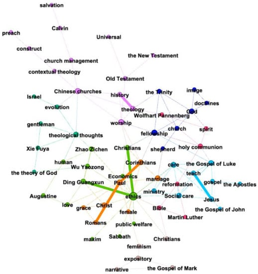 In order to give a clear illustration of the relationship between the hot research topics of Chinese Christian university students, the keyword co-occurrence network was constructed (Figure 2). To present a clear network, Figure 2 only includes the keywords that appear more than twice. The bigger the node and word are, the larger the weight is. The line between two keywords represents that they have appeared together. The thicker the line is, the more co-occurrence they have. The node “Paul” has thicker lines with “Romans”, “Corinthians”. So young scholars concerned are not only about the traditional Paul and his theology, but also on the cultural, political, and social world in which Paul and the early Christians lived. These studies aim at helping readers today for a more informed understanding of the life situation of the early Christians and the theology arising from it.
