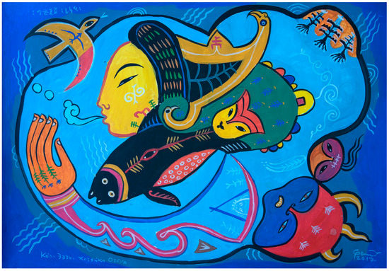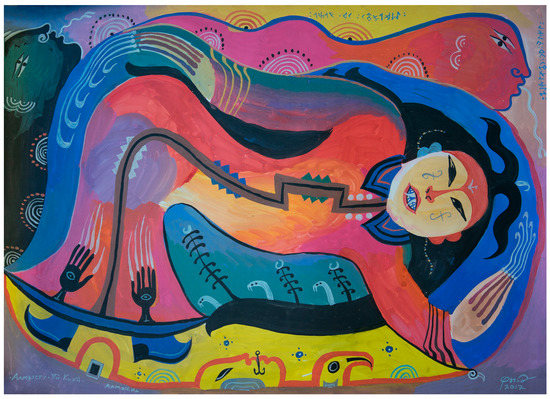 Sovetova and Shishina 2019, pp. 191–94). The hand and arm, depicted as a curve to the lower left of the painting, softening the square of the frame, are like a wave, imitating not only the flow of water but also the form of Altaic ornaments. Significantly, the arm appears to extend both from the “body” of the Lady and that of Taian Khan (SD), the mythical lord of the seas, wearing his red cap. The picture, therefore, encapsulates not only the Lady of the Lake but also the cosmic ocean of Taian Khan.