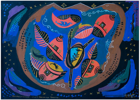 Benjamin 2016, p. 363), the Siberian term of “Sibiriak” is also sometimes used in the sense of “indigenous” in reference to people descended from historical newcomers, but already born in Siberia. It is worth emphasizing that almost all the “non-indigenous” artists associated with the Neoarchaic art trend are Sibiriaks, i.e., persons born in Siberia, who grew up here, and who, thus, feel and have the right to feel a strong connection with Siberia, which is also considered by them to be their homeland. The distinction between indigenous and non-indigenous does not, therefore, fully reflect the complexity of contemporary Siberian society.