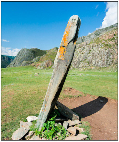 Figure 4). The stela is well known to local people, having been reproduced in various accessible publications. Another inspiration might have been the spectacular anthropomorphized Okunevo stelae from Khakassia (dated to the 2nd millennium BC,
