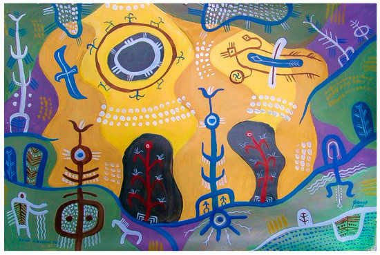 Таdina 2011, p. 150). The blue line in the picture can be then read as a boundary between the lower and upper worlds, as well as between the visible and invisible, or more accurately, a connective link between these realities. This is reinforced by the anthropomorphic figure on the extreme right of the composition. This blue line is its integral part, forming attenuated “arms”, suggesting that the figure simultaneously traverses both the upper and lower worlds. Furthermore, accepting that rivers in Altaic ontology are animated entities, the river in the picture offers a line of life/death through the anthropomorph. Three white wavy lines penetrate the torso of the anthropomorph, which are analogous to the lines emanating from the hands of a shaman-like figure shown in the bottom left corner of the painting.