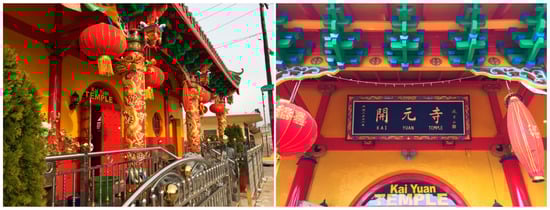 Two views of the façade of Kaiyuan Temple, in northern Philadelphia. Source: www.jivaka.net/philly (accessed on 4 June 2021), Creative Commons license.