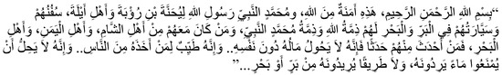 “In the name of God, the Compassionate and Merciful. This is a guarantee from God and Muḥammad the prophet, the apostle of God, to Yuḥanna b. Rū’bah and the people of Aylah, for their ships and their caravans by land and sea. They and all that are with them, men of Syria, and the Yaman, and seamen, all have the protection of God and the protection of Muḥammad the prophet. Should any one of them break the treaty by introducing some new factor then his wealth shall not save him; it is the fair prize of him who takes it. It is not permitted that they shall be restrained from going down to their wells or using their roads by land or sea”.(Isḥāq and Guillaume 1955, p. 607)
