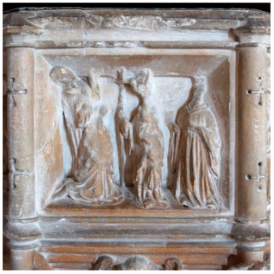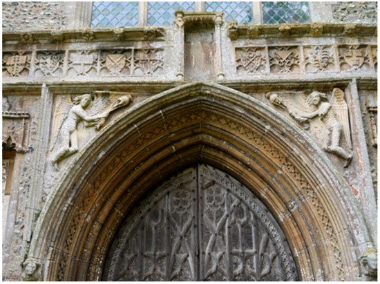 Architecturally, there has also historically been a connection between fonts and the doors of the baptisteries, churches and cathedrals in which the rite of baptism was practiced (Sonne de Torrens 2013, pp. 4, 14; Martin 2013, p. 31). This connection was often underscored in the imagery on and around the doors of the great cathedrals. Why should the west door angels at a great parish church like St Peter and St Paul not also be there to convey a baptismal message? Baptismal imagery is often victorious, with baptism being represented both as the victory or triumph of the Christian faith over other faiths and the supreme victory of eternal life over death (Sonne de Torrens 2013, p. 69). The censing angels at Salle bear a striking resemblance, in both form and position, to the winged victories on the Arch of Constantine in Rome (Figure 4).