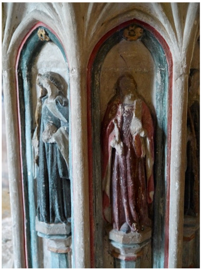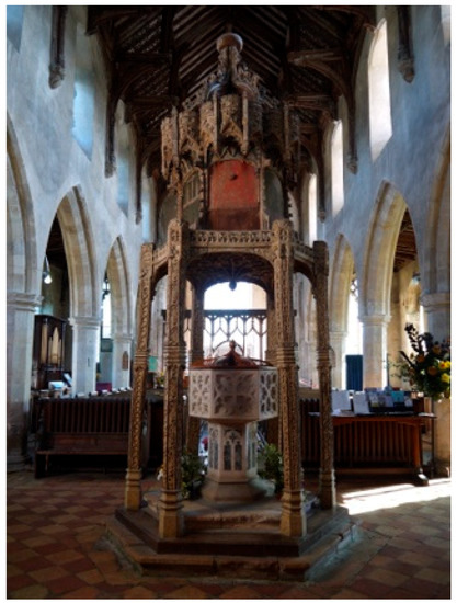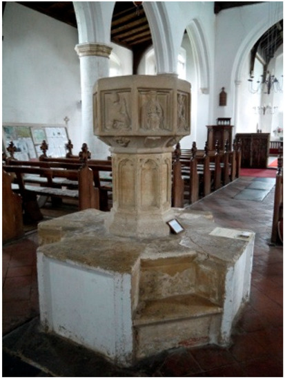 - Husenbeth, Frederick Charles. 1858. On Sacramental Fonts in Norfolk. Journal of the British Archaeological Association 14: 51–56. [Google Scholar] [CrossRef]