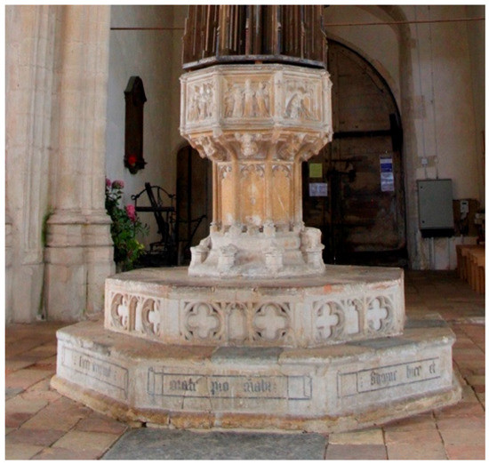 On the lower of the two risers, there is a dedicatory inscription (Figure 8). It reads: “Pray for the souls of Thomas Line [†1437] and [Agnes] his wife and Robert their son chaplain and for those whom they are bound to pray who cause this font to be made.” (Mortlock and Roberts 2007, p. 242).