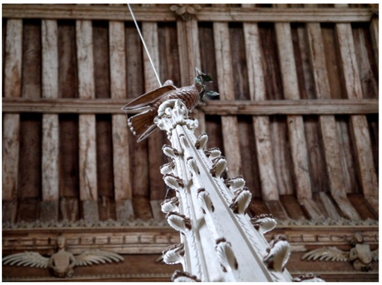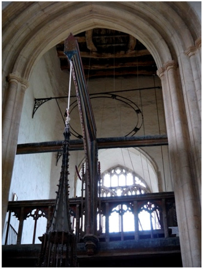 Paulinus of Nola (352–431 AD) described the Evangelists not only as springs but as “sonorous springs” (fontes sonori) (Underwood 1950, p. 122), an expression that inspired many a musical allusion in the millennium that followed. In the Lindisfarne Gospels, the Evangelists are shown blowing horns and trumpets and in the Soissons Gospels they are depicted as harts with little bells tied around their necks (Underwood 1950, p. 125). Bells, horns and trumpets became associated with the Evangelists, symbolising the harmonious sound of the Gospels heard all around the world as they concurred in the evangelical truth, much like Plato’s cosmic sirens had once uttered “one sound, one note” in “the concord of a single harmony.” (Underwood 1950, p. 125). At Salle, the relationship between bells and the four Evangelists is ingeniously, if perhaps unconsciously, hinted at: the font, around which they sit as guardian angels, is attached to the ringing gallery above by means of its soaring font cover and the arm and bracket that hold it in place and are used to hoist it up when the font is in use (Figure 9).