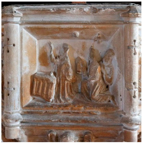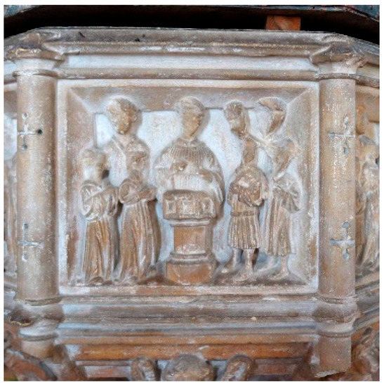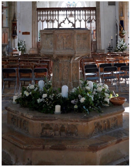 Why do I linger on the threshold, at the door, with the angels? In this instance it is perhaps to issue a reminder of the ancient, significant relationship between fonts and doors. Just as it is through the door that you enter the church, it is by means of the font and the rite of baptism that you enter the Church, and ultimately Paradise23 or at least the possibility of it. In the Middle Ages, when all was sacred, including the community, baptism was also the initiation rite by means of which you entered the sacred body of the commune (Ben-Aryeh Debby 2013, p. 15). The mere sight of the font would therefore have worked to give people both a vivid sense of historical continuity (in contemplating all the people who had been baptised there), and a feeling of belonging—to the community and its place—as indeed it continues to suggest to this day (Bloch 2013, p. 94).