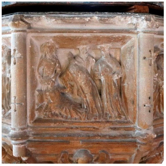 While none of the font descriptions can be faulted for being inaccurate4, they can, I argue, be held insufficient, and perhaps not quite to the purpose. I shall therefore complement the above vignettes with an exposé that aims to draw out what it is about the font at Salle that can be experienced as not merely beautiful or interesting, but also meaningful5 to people—believers and non-believers alike—who encounter it. The disclosure I hope to effect can only happen in and through what Heidegger calls poetry. The particular type of ‘poetry’ I use here is what is generally referred to as ekphrastic writing—in other words, a thoughtful and in-feeling (einfühlsam) account that seeks on some level to make sense of existence itself. In Heideggerian semantics, any form of writing that takes what he calls a poetic measure can also be considered poetry. While scientific measuring uses the known as a measure for the unknown, poetic measuring does the opposite: it takes a ‘mysterious measure’ by using the unknown to measure the known (Šišovski 2013, p. 9). It does this by describing the hidden, the invisible and the absent, using these to create an image of inner—essential—reality, that illuminates the visible and the ‘known.’ How we measure ultimately of course determines what we see, and what we see determines how we decide to treat what we see. Scientific measuring encourages us to compare a work of art, such as the seven-sacraments font at Salle, (favourably or unfavourably) to other works as well as to abstract categories of being (Sharr 2008, p. 28), whereas taking a mysterious, poetic measure of a work of art acts as an acknowledgment of its operation of setting up a world, of materially enshrining the very meaning of being, and thereby addressing our constant, tacit questions about our place in the world, about how and, above all, why we come to be here at all (Tonner 2014, p. 121; Boetzkes and Vinegar 2014, p. 2).