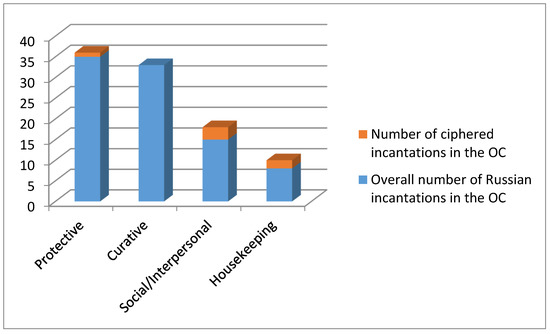 The functionality of ciphered texts in the OC is various enough. They include incantations about tsars and the authorities (No. 32), cattle release (No. 58), fistfights (No. 104), love spells (No. 107), incantations against snake bites (No. 109), against trees and foes (No. 124), and an incantation to scare mice away from stacked rye9 (No. 48). Thus, the incantations can be classified into groups based on their functions and topics: social and interpersonal (32, 104, 107), protective (124), housekeeping (48, 58), and curative (107). This classification is partly conventional, because, say, No. 124 can also be considered a text about social interactions (with foes). The curative incantation (against snakes) stands somewhat apart because it is of Karelian-Veps origin, only its title being written in Russian using lithorea10. It is important that the distribution of cryptographic texts by function and topic does not correlate with the general distribution of incantations by those groups in the Codex in general11 (see Table 2 and Figure 1).