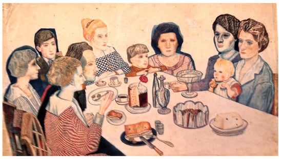 In Family Portrait Filonov included many members of his immediate family (see caption to Figure 6) who can also be identified in the family tree (Figure 7), although outsider and renegade, observer rather than participant, Filonov himself is noticeable by his absence. The composition begs many questions—the almost total absence of side plates and cutlery, the ten individuals with only three cups and three glasses, the vacuum background, the black, ‘cut-out’ silhouettes surrounding some of the figures—elements which elicit associations with a funerary repast than with a joyous celebration, or perhaps with an altar offering rather than with food for consumption. In any case, the subject of Family Portrait is not simply a group of close individuals, but also a scene common to many of Filonov’s paintings and drawings, i.e., of individuals at table, serious and detached, if not, lugubrious, as if observing a venerate ritual, reminiscent of some last and joyless supper as in the celebrated Feast of the Kings (1912–13, SRM), for example.