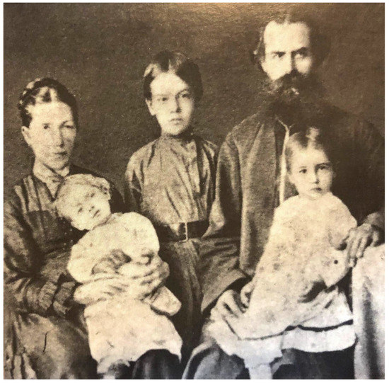 Anon.: Photograph of the Filonov family taken in Riazan’ in ca. 1882. From left to right: Liubov’ Nikolaevna Filonova, Aleksandra Nikolaevna; Petr Nikolaevich (1869–98); Nikolai Alekseevich (1832–87); Ekaterina Nikolaevna.