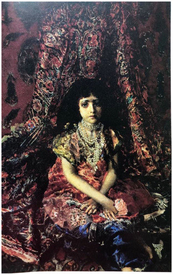 As for Arman Aziber (Armand Azibert), fresh information has come forth recently regarding his life and work, which helps clarify his position in the St. Petersburg business world and certain issues surrounding the extraordinary oil Portrait of Arman Aziber and His Son which Filonov painted in 1915. The assumption that Filonov had painted this double portrait from a photograph after Arman had died in action at Souain Perthes-lès-Hurlus, Marne, on 29 February, 1915 (according to his Death Certificate) was often questioned and, in fact, at least one source still denies the rumour, asserting that the portrait was painted from life14—even though Filonov himself mentioned that the portrait was “after a photograph”15 and the actual photograph was discovered among family papers and reproduced for the first time in the Dusseldorf catalogue of the Filonov retrospective,16 providing ample testimony not only to Filonov’s phenomenal skill—to his ‘Photo-Realism’—but also to his delicate pictorial adjustments and impositions as in the facial expressions, the hairstyles and the carpet. The carpet, in fact, recalls the luxurious fabrics of Mikhail Vrubel’s Girl against a Persian Carpet (1886, Figure 16) where the model holds a pink rose much as the boy does in the Aziber portrait, and of Fortune-Teller (1894–96; State Tretiakov Gallery, Moscow). Here, is the same kind of minute elaboration and organic decoration as in the florid mantle of Filonov’s Icon of St. Catherine or her ornamental scroll, the script of which is still entirely legible, i.e., Verse 7 from Psalm 139: “Kuda poidu ot Dukha Tvoego, i ot litsa Tvoego kuda ubegu” [Whither can I go to escape Your Spirit? Whither can I flee from Your presence?].