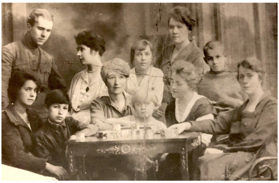 Anon.: Photograph of members of the Filonov family, Petrograd, ca. 1920. Left to right: Nikolai Aleksandrovich Gue; Liubov’ Aleksandrovna Gue; René Aziber (Azibert); Aleksandra Aleksandrovna Gue; Ekaterina Fokina-Aziber; Mariia Aleksandrovna Gue; Vladimir Aleksandrovich Gue; Aleksandra Niklaevna Filonova-Gue (seated); Mariia Nikolaevna Filonova (seated); Nikolai Aleksandrovich Gue; and Evdokiia Nikolaevna Filonova (Glebova-Putilevskaia).