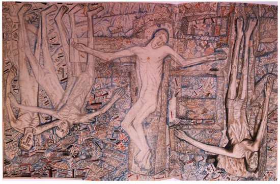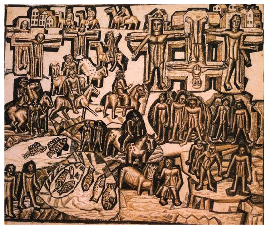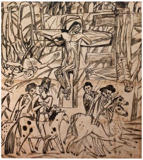 The Orthodox connection, in particular, betrays Filonov’s upbringing in a strict, Christian family (Podmo recalled that “Filonov belonged to the merchant class, so his parents had brought him up in the Orthodox faith”),19 with its unfailing celebration of Easter, something which latently, at least, remained a vital point of departure for his aesthetic and philosophical journey, even transmuting itself in some of the politically tendentious and atheist pictures of the Soviet period. In any case, according to his autobiography, Filonov undertook a pilgrimage to the Holy Land in 1907, visiting Constantinople, Mount Athos, and Jerusalem, and the Monastery of St. Catherine in the Sinai Desert,20 painting souvenir icons en route to cover his expenses—a prelude to master paintings such as St. George, the Victorious, Mother and Holy Family.21 Additionally, according to his autobiography, Filonov copied an engraving of a Crucifixion for monks in Jerusalem, which perhaps looked forward to his Golgotha (1912, Figure 18) and two other paintings of the crucifixion, i.e., Execution (After 1905) 1913, (Figure 19) and Execution (1920–21, Figure 20). In 1914 Filonov even argued that the artistic center of gravity was moving to Russia, “our motherland, creator of marvelous temples, of the art of artisans and of icons”.22