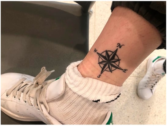 Tattoos also involve penance, a common religious dynamic. Tattoos are painful; getting them hurts. Respondents knew this and were prepared to face the pain. Rowan (non-affiliated, 19) got a tattoo of a compass on her ankle (see Figure 1):
