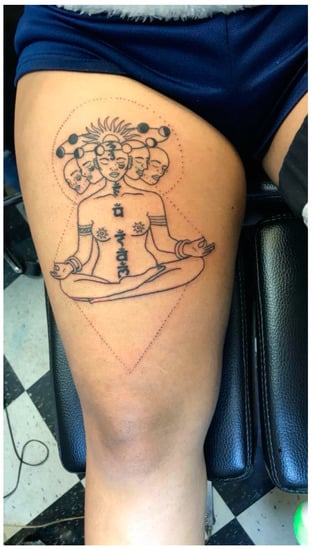With her tattoo, Keke, who identified as Agnostic, is challenging the idea of divinity, a female, multi-headed, tattooed power (see Figure 2). Her commitment is religious, although with an alternative way of understanding religion. Her tattoo openly challenges the image of a male god, and since it is facing outwards, we can assume it is a statement that she wants to communicate to others, as a reverse corroboration of what Dougherty and Koch (2019) found.