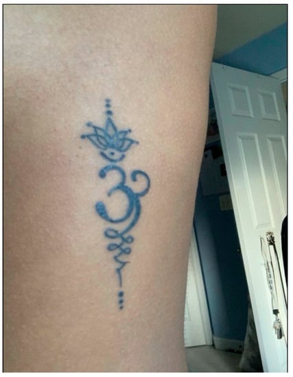 Other respondents had easier experiences negotiating their tattoos with their religious heritage. Maia (Hindu, 19) found it easier to rely on her mother’s side of the family, who were “much more progressive Indian” than those on her father’s side, who were “much more strict Indian”. She chose the location of her tattoo carefully so that “when you wear Indian outfits, its’ cropped, all the tops are cropped and I did not want my dad’s side of the family to necessarily know that I had a tattoo, even though it is for religious reasons” (see Figure 3).