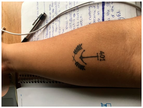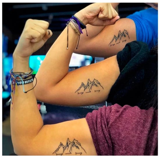 Tattoos might be used to express passage into adulthood, a way to build and project identity (Dann et al. 2016). Numerous respondents wanted to remember relations that shaped who they were, to preserve the link they had with significant persons, or to memorialize a conviction they had at some point in their lives. These were all experiences that were meaningful for them, but risked vanishing because of distance and time going by. Many respondents mentioned having matching tattoos with friends (Rebecca, Protestant, 21), cousins (Ana, non-affiliated, 18), siblings (Esther, Seventh-day Adventist, Kelly, Catholic, 18—see Figure 4; Esther, Seventh-day Adventist, 19—see Figure 5, and mothers (Keke, Agnostic, 19; Maia, Hindu, 19—see Figure 3; Kenedi, Catholic, 21; Chelly, Catholic, 22). Interestingly enough, among the male respondents in our sample, only one reported a “father–son” tattoo, and this with caveats: Steve (Catholic, 22) said, “My dad got a tattoo at the same time and he got a Celtic tattoo but it’s not the same thing or for the same reason. And his is different but we went in at the same time to get it.”
