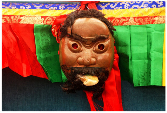 A copper mask embellished with hair used by the Daur shaman is called Abagaldai. According to Humphrey, the Abagaldai is “the main barkan of the ritual”, and people put most of the offerings before him (Humphrey and Onon 1996, p. 242). The Abagaldai mask represents the spirit of the black bear. It is said that it is the head of all tutelary spirits. Traditionally, its hair, eyebrows, and mustache were made of hair from a bear (Figure 3) (Lü and Qiu 2009, pp. 62–64; Zhurongga and Manduertu 1985, p. 256)7).