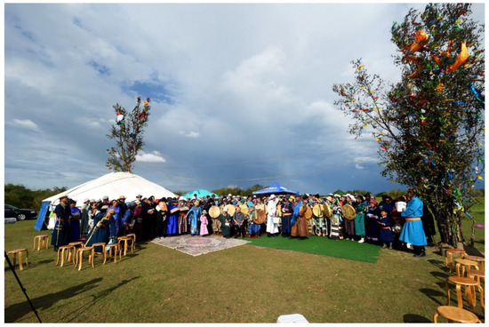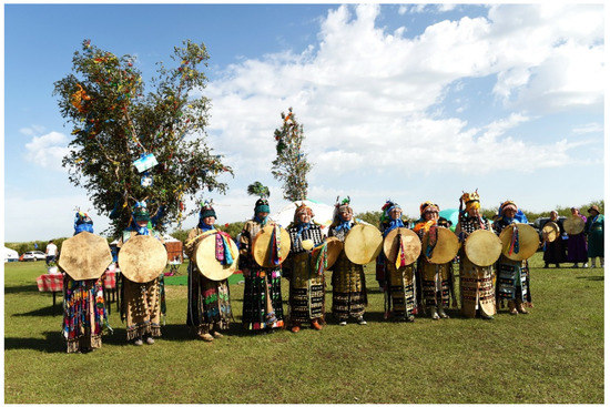 Between the two inner trees, three cross bars made of plum wood were tied to represent a spirit ladder in order to enable the spirits to descend. A pair of stuffed cloth snakes (one black, one white) would be tied to the bottom of the trees. Idols and pictures of the shaman’s barkens would be placed on the inner altar behind the trees. Beside the trees, the shaman’s costume and Abagaldai mask would be hung. Pictures of the Sun and the Moon as the symbols of tengger would be hung on the outer trees. Beside the trees, the outer altar would be set up. Volunteers and participants would tie colored ribbons on both the inner tooroo and outer tooroo to show their respects to the spirits (also, see Batubaoyin 1991, pp. 113–14; Ding and Saiyintana 2011, pp. 61–66; Humphrey and Onon 1996, pp. 237–250; Kara et al. 2009, pp. 151–52; Lü and Qiu 2009, pp. 82–101). These actions, as described by Humphrey and Onon (1996, p. 239), “were recognized by Daurs to be ancient and therefore generally a good thing, even if their urgent aim was not to preserve them so much as to ‘refresh’ the spirits, which were retained mainly in oral forms of memory”.