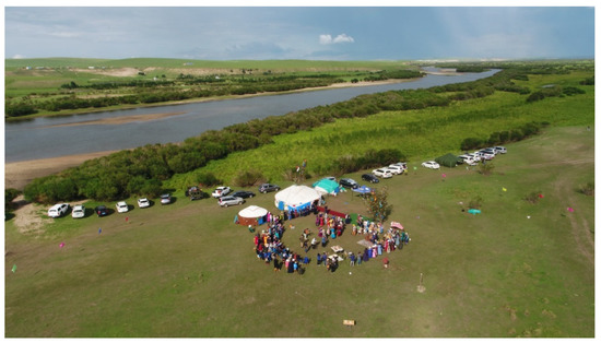 While shamans and other specialists are invited to perform in the authority-organized public sacrifice activities, they never discontinue clan-based rituals in a half-open way. I use the word “half-open” here because these rituals are not open to everyone but only to their hala-mokon members. The most conventional rituals include the ominan, the eelden, the purification, and the initiation. The ominan is the greatest shamanic ritual in Daur shamanic practices10. It takes place every three years and lasts three days. Clan members participate in the ritual communally, and all spirits are invited to descend. Aside from the host shaman, a high-level great shaman (da yadgan) will be invited to be the leader of the ritual. Other shaman students of the great shaman are also present to perform communally (Figure 5) (Batubaoyin 1991, pp. 113–17; Ding and Saiyintana 2011, pp. 61–66; Humphrey and Onon 1996, pp. 237–50; Meng 2019, pp. 102–8; Zhurongga and Manduertu 1985, pp. 262–64). Humphrey rightly says that not only is the ominan “a shamanic equivalent of the communal sky/mountain cult”, but it is also “a ‘meta-ritual’ containing an overarching summation of yadgan shamanship as a whole” (Humphrey and Onon 1996, p. 237). The eelden takes place every year or every other year. It usually lasts one day, the same as the initiation ritual. Except for the purification held at home on the day marking the beginning of the lunar calendar year, the ominan, eelden, and initiation rituals were in the past held either in the shaman’s courtyard or in the wild (Zhurongga and Manduertu 1985, pp. 262–64). Today, according to my fieldwork data, most ritual locales are chosen to be in the wild, usually on meadowland by a river (Figure 6).