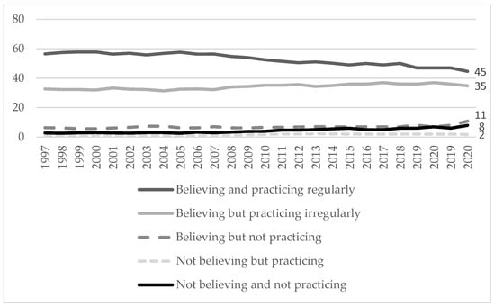 Secularization and individualization trends in Polish religiosity began to appear after Poland joined the European Union in 2004. This was a time that additionally coincided with the death of John Paul II, who had been an exceptional authority for Poles and undoubtedly attracted people to church. After 2005, declared participation in church rituals slightly but systematically decreased, reaching values significantly lower than those recorded during the Pope’s lifetime. The signals are particularly clear in the case of young people, residents of the largest cities, and people with a higher education (). From 2005 to today, the percentage of Poles who define themselves as believers and who regularly practice religion (at least once a week) has decreased by 13% (from 58% to 45%). At the same time, the numbers of believers who are non-practitioners increased (from 7% to 11%) as did the numbers of non-believers who are non-practitioners (from 3% to 8%). Among people aged 18–24, these trends are even more telling. From 2005 to 2020, the percentage of believing and regularly practicing youth over 18 decreased from 51% to 28%. At that time, there was a 16-point increase in the percentage of non-believers and non-practitioners in this group (Figure 1).