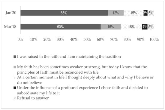 Poles’ declarations of faith have changed much more slowly than their declarations relating to religious practice (invariably, over 90% of Poles describe themselves as Catholics and almost the same percentage consider themselves believers). However, the turn toward a more individualized and simultaneously less institutionalized religiosity, not requiring attendance at Sunday mass, seems quite obvious. The selectivity and individualization of Poles’ faith is also visible in the doctrinal dimension. While considering themselves to be believers and even regularly participating in religious practices, they often not only do not accept many basic tenets of the faith but also frequently hold ideas that are contrary to the Catholic religion. Thus, model institutional religiosity—manifesting itself through an attitude fully reflecting identification with the doctrine of the faith and full acceptance of religious moral norms, confirmed by systematic participation in religious worship and with a simultaneous personal experience of religion and commitment to the religious community—has significantly declined in importance in Poland since 2005 (). The religiosity of Poles is largely based solely on the cultivation of tradition. In January 2020, as many as two-thirds of adult Poles surveyed by CBOS, in defining their faith, chose the answer, “I was raised in the faith and am maintaining the tradition” (66%). Not quite one in three respondents (30%) described their faith as “deep”; of these, a majority (15%) stated that at some point in their life they had thoroughly thought about what and why they believed or did not believe. One in eight admitted that their faith had been sometimes weaker or stronger, but said that today they know the principles of faith must be reconciled with life. Others (3%) had chosen faith under the influence of a profound experience and decided to subordinate their life to it (). In the course of not quite two years, Poles’ convictions about the traditional nature of their faith increased by six percentage points, and the percentage of those who declared having a deep faith decreased by the same amount (Figure 2).
