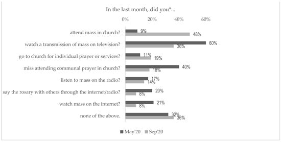 Over time, along with changes in the restrictions, the religious behavior of Poles changed. During the September study, there was no limit on the number of people who could be in church simultaneously, but the daily number of COVID-19 cases was several times higher than in May. Consequently, Poles returned to churches—but only partially (not on the same scale as before the pandemic). The reason people might not have attended mass physically, despite the possibility, might be real fears for their health, or it might also be partially due to their having abandoned religious practices, as indicated by the increase in the percentage of people who did not declare having participated in any of the above-mentioned religious behaviors (from 32% to 36%), including those behaviors that did not require a physical presence in church (details in Figure 3).