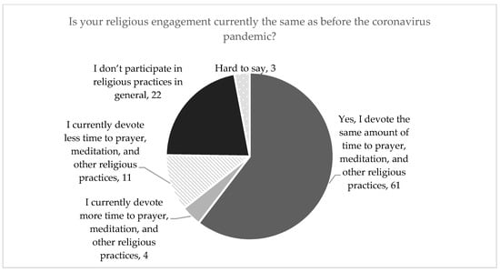 The uncertain impact of the pandemic on religiosity has been confirmed by the results of research that have already been published. On the one hand, we can observe the growing importance of religiosity. In March 2020, the share of Google searches for prayer surged to the highest level ever recorded, surpassing all other major events that otherwise call for prayer, such as Christmas, Easter, and Ramadan. The level of prayer search shares in March 2020 (The World Health Organization declared COVID-19 a pandemic on 11 March 2020) was more than 50% higher than the average during February 2020. The rise in prayer at the beginning of the pandemic was a global phenomenon, with all countries (except the least religious 10%) seeing significant rises in prayer search shares (). It has also been indicated that people experiencing fear, suffering, or illness in a pandemic often experience a “spiritual renewal”. Therefore, some authors speak of the formation of a new “coronavirus generation”, in which the development of spirituality creates a mature attitude based on truth and freedom (). A similar phenomenon has also been confirmed by the results of the international Pew Research Center study, according to which many people around the world, especially in the United States, state that the outbreak has boosted their faith (). Brazilian research has also shown an association between religiosity and spirituality and the positive mental health consequences of social isolation (). Italian findings also suggest that under dramatic circumstances a short-term religious revival is possible, even in contexts where the process of secularization is ongoing. However, it only applies to people who suffered from the most severe effects of the crisis and those who are already religiously socialized ().
