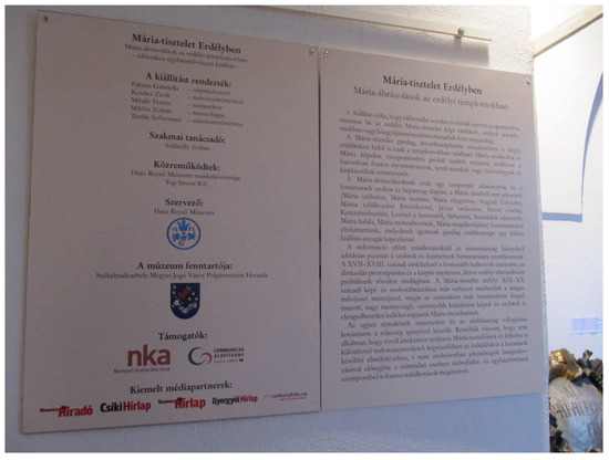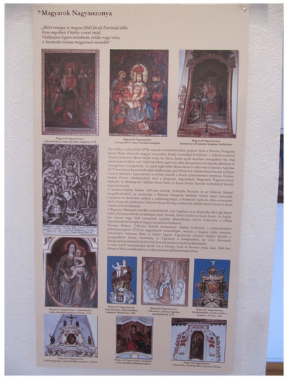 The curators of “Marian Devotionalism in Transylvania” confronted the same problem that Haáz had as he prepared his collection, insofar as he imagined these pieces to represent a Transylvanian Hungarian artistic tradition. He needed to find thematic and formal continuities among pieces from villages whose residents had little face-to-face contact with people outside these communities and did not think of themselves as self-consciously producing a Transylvanian regional artistic tradition. As Benedict Anderson argues, because members of even the smallest nation never know most of their fellow members, national intellectual entrepreneurs must identify these individuals with a larger community and construe their activities in such a way that “in the minds of each lives the image of their communion” (Anderson 1987, p. 15). The disparate pieces had no essential thematic unity. Instead, curators were challenged to organize the selected objects to best establish their national and religious representativeness: their producers’ identification with a tradition of Transylvanian Hungarian Catholic devotional art. The thematic unity of the pieces was primarily achieved through posters that juxtaposed a number of the statues and icons—both those present in the gallery and others that remained in situ in village churches—under headings, photographs, and explanatory text.