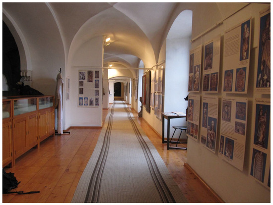 “Marian Devotionalism in Transylvania” appeared in museums in three cities vying to become centers of contemporary Transylvanian Hungarian cultural life. These exhibitions were curated by ethnologists, art historians, and curators affiliated with the Rezső Haáz Museum in the city of Odorhieu Secuiesc with financial support from the Hungarian state’s Hungarian National Cultural Foundation (Nemzeti Kulturális Alap) and the Communitas Foundation, the official Catholic ecclesiastical charitable organization (Mihály 2010, p. 2) (See Figure 1). It was the museum’s featured show, occupying the entire exhibition space of several large rooms and an entryway. The collection was transferred unchanged to the Catholic Church’s hotel and conference center, the Jakab Antal Study House, near the city of Miercurea Ciuc, before moving with a reduced number of exhibited pieces to an exhibit space in the John the Baptist Parish Church in downtown Târgu Mureş, where I had an opportunity to view the collection in person and interview its curators (Szász 2010).