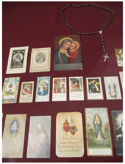 While Kosselleck argues that grave inscriptions are the primary material artefact for ascribing a national mission to the dead, in Transylvania, political labor performed on dead bodies extends far beyond the cemetery to include exhibitions of Catholic devotional art (Verdery 1999, p. 28; Koselleck 2002, pp. 285–300). During my fieldwork, I visited an exhibition of World War I-era Catholic prayer cards mass-produced for infantry, who had carried with them to the Eastern Front images of the Virgin Mary calming and comforting soldiers in stressful battle situations. The town council had used a room in a local school for the exhibition and timed it to coincide with a government-sponsored project to restore a cemetery for World War I soldiers. The soldiers’ heroic qualities dominated public discourse about that undertaking, in response to Romanian state officials’ use of this motif in commemorative projects begun in the early 2000s. Competitive claims-making and “ethnopolitical contestation,” Brubaker et al. have shown, are central features of post-socialist Romanian–Hungarian public discourse (Brubaker et al. 2007).