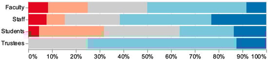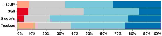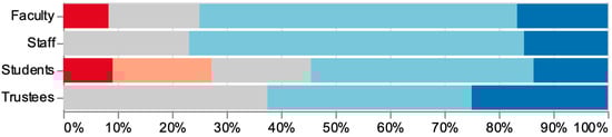 All groups perceived bivocational ministry to be an intentional career path with vocational integrity (Figure 4). Approximately 75% of faculty and staff agreed that “bivocational ministry is an intentional career path for ministry” (Q6); 2 in 3 trustees and a majority of students also agreed. There was no disagreement among staff and trustees; however, 1 in 4 students disagreed.