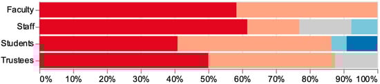 Between the dates 19 November 2020 and 3 December 2020, the project director administered four surveys, each to a different constituency of Lancaster Seminary (Supplementary S1). The project received prior approval for human subject research. Surveys of current students and faculty (adjunct faculty as well as fully funded faculty) were conducted through the seminary’s learning management system, Moodle. Surveys of staff and trustees were conducted through Google Forms. The entire population invited to participate consisted of 186 persons: faculty (38), staff (29), students (98), and trustees (21). A significant proportion participated: faculty (32%), staff (45%), students (22%), and trustees (38%). In aggregate, N = 55, consisting of faculty (12), staff (13), students (22), and trustees (8).