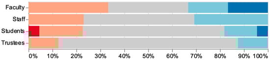 Survey instruments are provided in the Supplementary S1. The first 17 questions were identical on all four surveys and utilized the same Lickert scale: strongly disagree, disagree, neutral, agree, strongly agree. Responses are reported below in the form of color-coded charts (Figure 1). Additional questions were asked separately of each constituency.