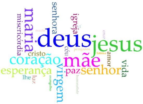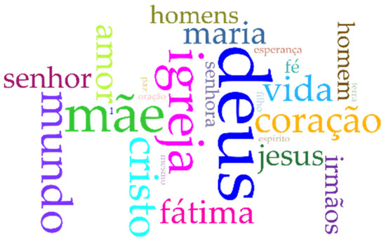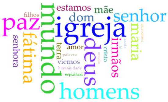 The message of John Paul II during his three trips to Fatima and Portugal was brought forward by the following words (See Figure 3): “God” (deus 216), “Church” (igreja 164), “Christ” (cristo 144), “Mother” (mãe 140), “Life” (vida 120), “World” (mundo 119), “Men” (homem 112).