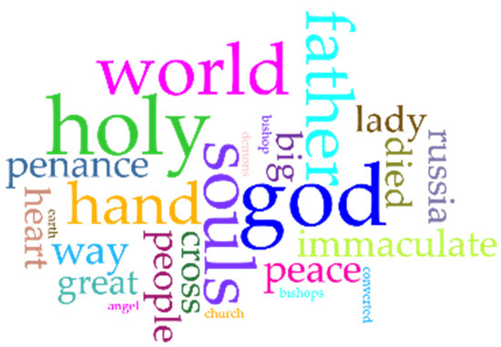 As seen on Figure 6, the result is telling. The most important terms are “God” (6), “Holy” (6), “Father” (5), “Souls” (5), “World” (5), “Hand” (4), [less visible as in singular and plural but together also prominent bishops/bishop 4], “Big” (3), “Cross” (3), “Died” (3), “Great” (3), “Heart” (3), “Immaculate” (3), “Lady” (3), “Peace” (3), “Penance” (3), “People” (3), “Russia” (3), “Way” (3) and among the terms mentioned twice are: “Angel”, “Church”, “Converted”, “Demons”, “End”, “Fear”, “Flames”. Again, as in the papal addresses “God” ranked high, the pope is an issue himself—“Holy Father” -, and the Virgin Mary appears as “Lady”. We read also again the familiar terms “World”, “Heart”, “Peace” and “Church”. However, among these well-known buzzwords suddenly the other discourse emerges: “Penance”, “Russia”, “Died”, “End”, “Fear” and “Flames” rank also high. The popes told only half of the story. The contested issues of the message of Fatima were omitted.