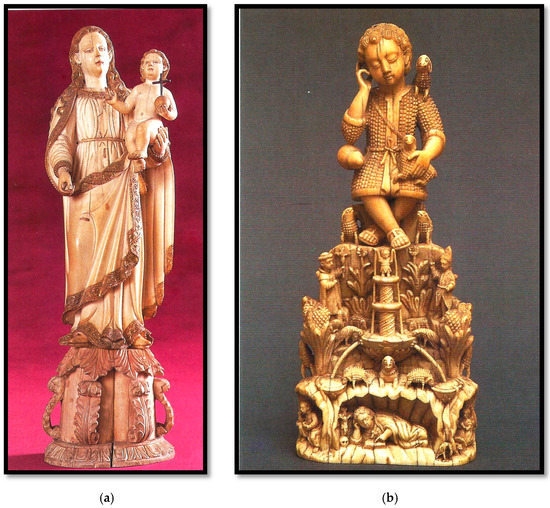 Between 1580 and 1640 the entire Iberian Peninsula, as well as Spanish and Portuguese overseas possessions, were under the Spanish Habsburgs, leaders of the Catholic Reformation. As Hindu worship and tradition were suppressed by the Portuguese, ecclesiastical arts were appropriated to convey the Christian message to the new converts. During the sixteenth century, Christian religious sculptures, carved in ivory from African elephant tusks, together with Indian spices, textiles, gemstones, and various precious objects, were transported by vessels to Portugal (Figure 2) (Malekandathil 2012, 2019).