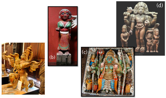 Wooden Hindu statues of Kerala: (a) Garuda, Kerala Folklore Museum, 17th/18th century; (b) Tribal Woman, Kerala Folklore Museum; (c) Durga, Polychrome relief, ca.18th century, Thrikkuratti Mahadeva Temple; (d) Shiva as Bhikshatana Murti (beggar), Kerala Folklore Museum.