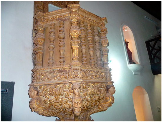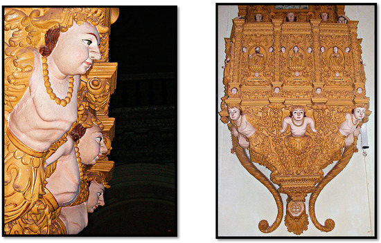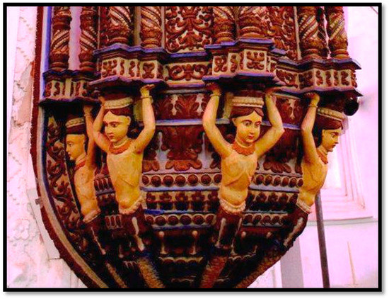 Another example of polychrome wood carving executed by local artisans are the pulpits of Goan churches that exemplify the unique synthesis of Christian ecclesiastical artforms imported from Europe with indigenous iconography. Among elements that were re-embodied in Christian objects are the human–serpent hybrids carved on the base of pulpits (Figure 9, Figure 10 and Figure 11).