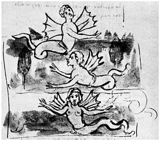 Although the lower extremities of mermaids and sirens were usually represented as fish tails, they were sometimes depicted in the form of a serpent, as seen in a medieval manuscript illustration of the Greek Physiologus (Figure 14).