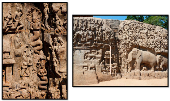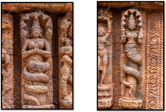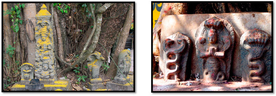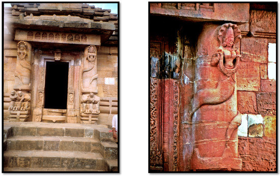 Nāga or nagini sculptures were salient as protectors of the entrance to the temple and its sanctum (dvārapālakās) (Figure 18, Figure 19 and Figure 20).