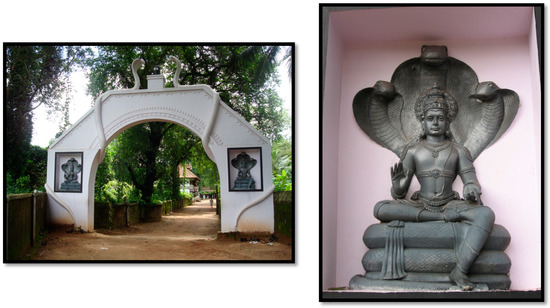 They were evoked in legendary accounts of the origin of Malabar as its first inhabitants and guardians of underground treasures (Tarabout 2015). In the sacred groves of Kerala, equated with wild untouched forest, worshipers still present serpent deities with milk and other offerings to ensure protection and avert misfortunes. Most Kerala temples have a subshrine for Naga worship. The largest temple in Kerala specifically dedicated to the serpent cult is the Mannarassala Śri Nagaraja temple, frequented by women suffering from infertility (Figure 17).