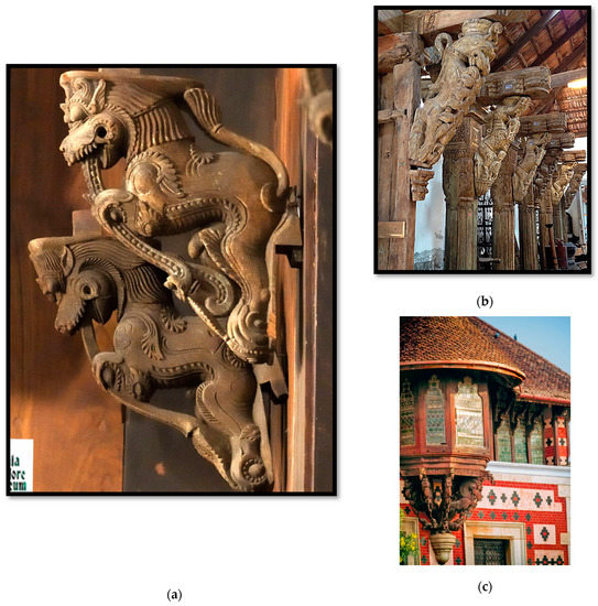 (a,b) Wooden Vyali corbels from Hindu temples in Kerala and c. detail of Vyali corbels of Napier Museum, Travancore, Kerala designed by Robert F. Chisholm, 1873.