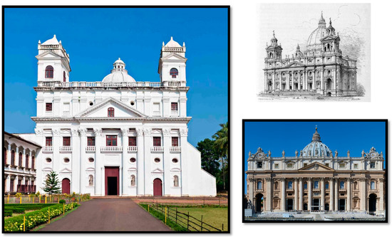 Church of Nossa Senhore da Divina Providencia, Goa, 1656–1672; Carlo Maderno, design for façade of St. Peter’s Basilica, with towers (right above) and executed façade (below), Vatican, 1608–1614.