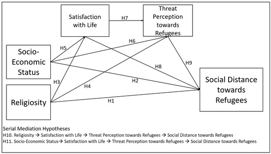In every society, refugees face social and economic exclusion. In particular, social distance towards refugees may be seen remarkably in cities where host people and refugees live together intensely. This study examined essential predictors of social distance towards refugees: religiosity, socioeconomic status (SES), satisfaction with life, and threat perception towards refugees. A quantitative research strategy was used to collect cross-sectional data from 1453 individuals via an online questionnaire in Turkey. Confirmatory factor, correlation, regression, and mediation analyses were conducted. In this study, the effect of religiosity and socioeconomic status on social distance towards refugees and the serial mediation effects of satisfaction with life and threat perception towards refugees on this relationship were analyzed. Questions related to age, gender, marital status, education level, and having refugee neighbors or not were used as control variables. It was found that religiosity and SES were associated with social distance towards refugees. Furthermore, in the effect of religiosity and SES on social distance towards refugees, the serial mediating roles of satisfaction with life and threat perception towards refugees, respectively, were identified.