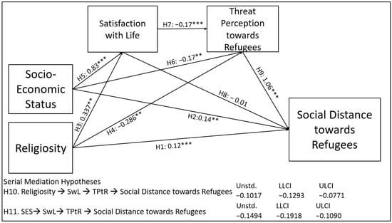 shows the correlation analyses between the variables. While the age variable had a positive correlation with satisfaction with life (r = 0.102, p < 0.01) and religiosity (r = 0.187, p < 0.01), it had a negative correlation with education (r = −0.520, p < 0.01) and socioeconomic status (r = −0.292, p < 0.01). There was a positive relationship between education and socioeconomic status (r = 0.344, p < 0.01), and a negative relationship with religiosity and social distance towards refugees (r = −0.249, r = −0.070, p < 0.01, respectively). A negative association was found between religiosity and socioeconomic status, threat perception from refugees, and social distance towards refugees, and a positive relationship was found with satisfaction with life (r = −0.255, r = −0.286, r = −0.159, r = 0.337, p < 0.01, respectively). Conversely, a positive relationship was found between socioeconomic status and satisfaction with life, threat perception towards refugees, and social distance towards refugees (r = 0.154, r = 0.058, r = 0.059, p < 0.01, p < 0.05, p < 0.05, respectively). There was a negative association between satisfaction with life and threat perception towards refugees and social distance towards refugees (r = −0.301, r = −0.231, p < 0.01, respectively), and a strong relationship was observed between threat perception towards refugees and social distance towards refugees (r = 0.825, p < 0.01). Therefore, hypotheses H3 and H4 were accepted.