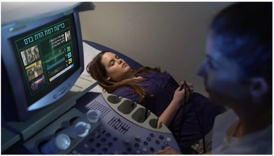 The video ‘Interview with declarers of religiousness’ (Figure 4) (2018) presents a religious girl who having declared her religiousness (so as to obtain an exemption from military service), is invited by the IDF to pass what seems, in the video, to be a test administered using a so-called “religion meter”—a sort of ultrasound device that examines a person’s religiousness level. It should be noted that historically the video had, in fact, been produced in response to the army’s demand to examine the credibility of the declarations made by religious girls seeking exemption from military service for religious reasons—but we propose analyzing it in a way that identifies messages that are certainly relevant to the campaign that presents a counter script for military service of religious women, while focusing on the communal reward of the service.